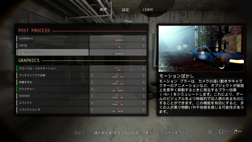 【酔いにくくするための設定】 モーションぼかし(モーションブラー):オフ このゲームが酔いやすくなっているほぼ全ての原因。 FPSやVRで酔ったことのない筆者でも、有効にしているとめちゃくちゃ酔いました。 GRAIN:オフ 個人的にはOFFにした方が酔い...